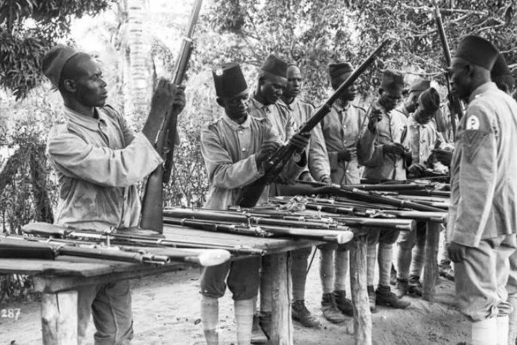 An image of Africans inspecting guns in colonial Africa: Guns from Europe.