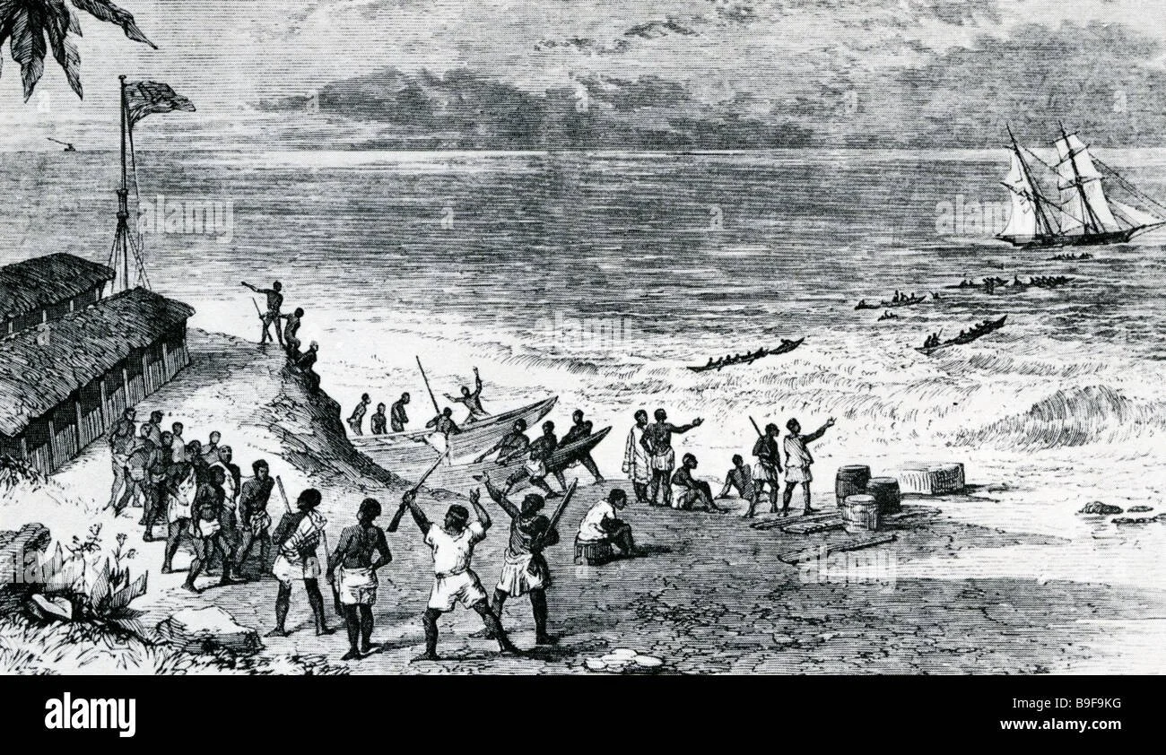 A 19th-century illustration depicting a scene on the West African coast, with European ships anchored offshore and African merchants and captives on the beach.