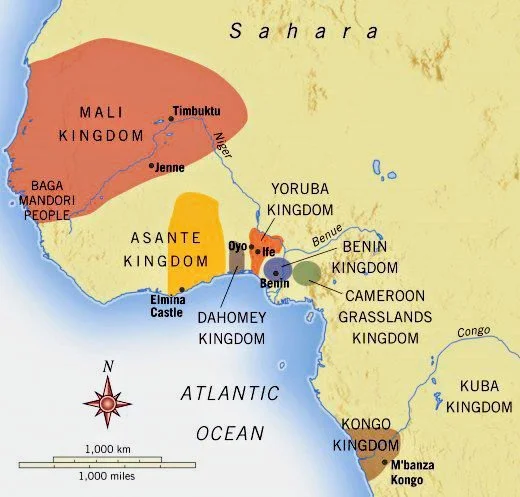 A map of West Africa from the 17th-18th centuries, highlighting the kingdoms of Dahomey, Asante, Oyo, and Kongo, along with major slave-trading ports.