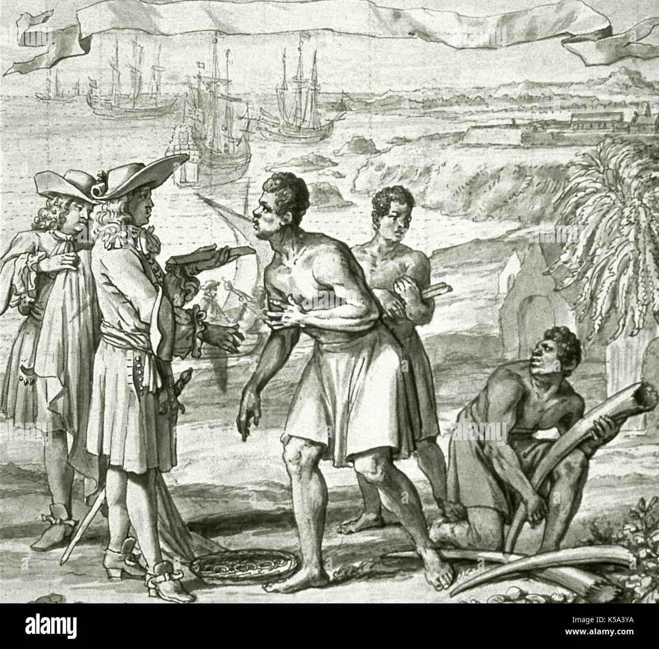 An 18th-century print showing European traders negotiating with an African leader on the coast, with goods like muskets, ivory, and beads displayed.