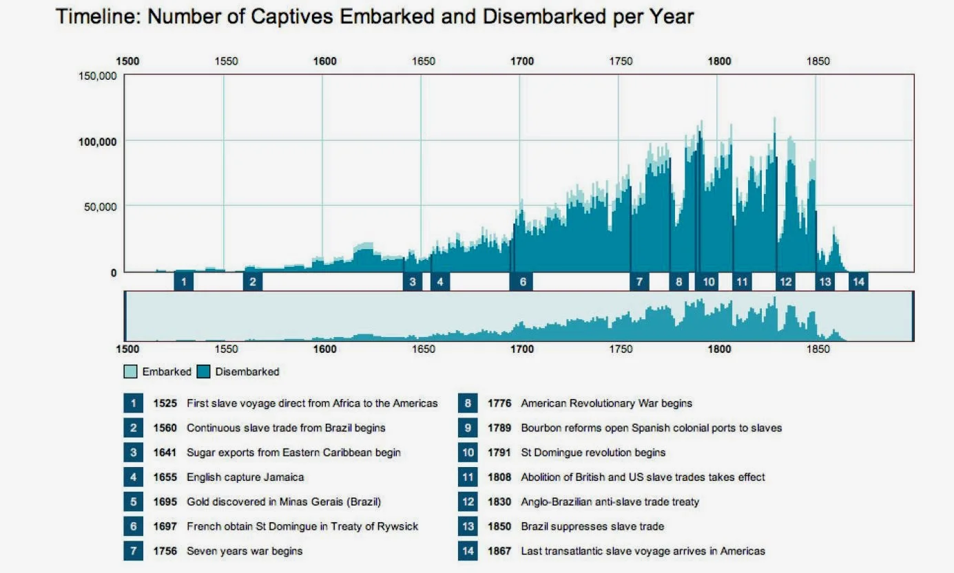A graph from the Slave Voyages Database (slavevoyages.org) showing the staggering number of captives embarked from different regions of Africa over time.